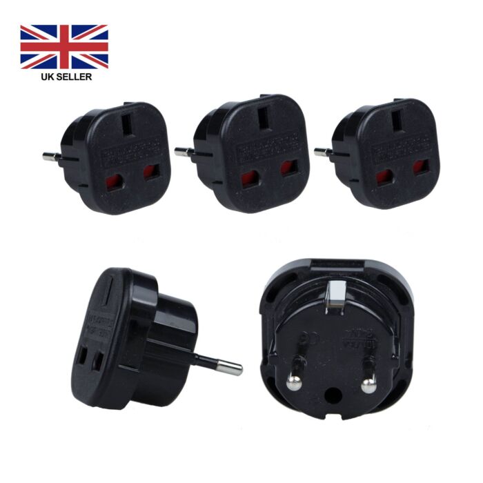 VOLTAGE: The UK to EU travel adapter converts a standard UK 3 pin plug into a 2 pin EU plug and can process a voltage of 240V and 7.5AMP.LIGHTWEIGHT AND PORTABLE: The small and lightweight build of the product make it the perfect item to use when travelling or out on location as it easily can fit in your hand luggage.HIGH QUALITY AND RELIABLE: These adapters can be used in many EU countries making it a reliable product for your needsUK to EU ADAPTER: The EU travel adapter is an essential part of any holiday whether youre travelling for business or pleasure.PACK OF FIVE: Included with this product is FIVE separate UK to EU adapters allowing you extra freedom and usage when travelling across different locations.VOLTAGE: The UK to EU travel adapter converts a standard UK 3 pin plug into a 2 pin EU plug and can process a voltage of 240V and 7.5AMP.LIGHTWEIGHT AND PORTABLE: The small and lightweight build of the product make it the perfect item to use when travelling or out on location as it easily can fit in your hand luggage.HIGH QUALITY AND RELIABLE: These adapters can be used in many EU countries making it a reliable product for your needsUK to EU ADAPTER: The EU travel adapter is an essential part of any holiday whether youre travelling for business or pleasure.PACK OF FIVE: Included with this product is FIVE separate UK to EU adapters allowing you extra freedom and usage when travelling across different locations.
