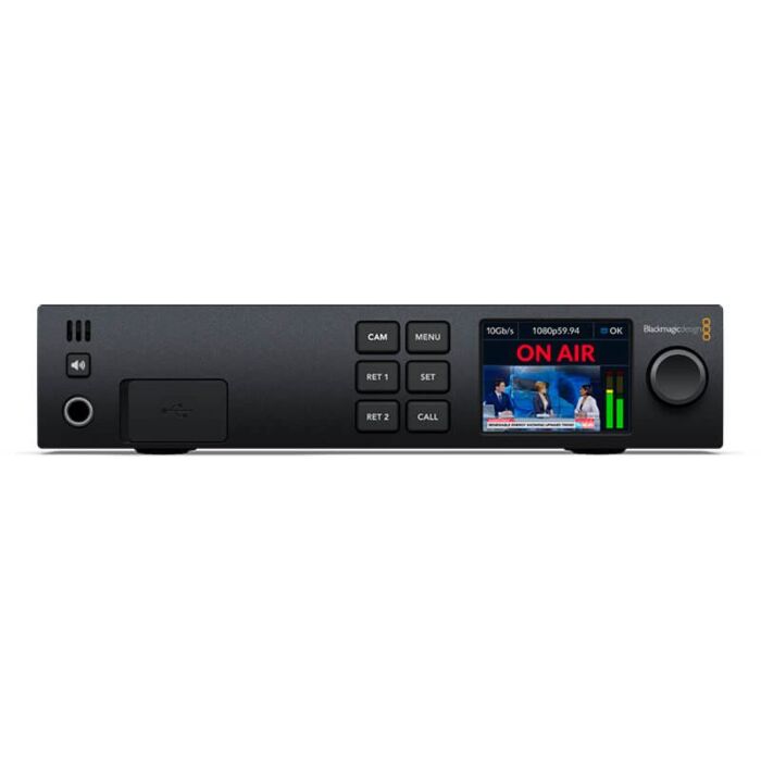 With 10G Ethernet on the Pro model, you can connect all signals to the camera with the one Ethernet IP link connection. That means the camera feed, return program feed, timecode, reference, tally, talkback and control are all sent down the single cable. That's the same benefits of SMPTE fiber, but the standard 10G copper Ethernet cable is much lower cost. The Blackmagic Studio Converter allows breakout of all the video, audio and talkback connections at the studio end. It also includes a massive power supply that powers the camera down the Ethernet cable, so you don't need a power source near the camera. Plus you can fit 2 per rack unit using a Blackmagic Universal Rack Shelf.