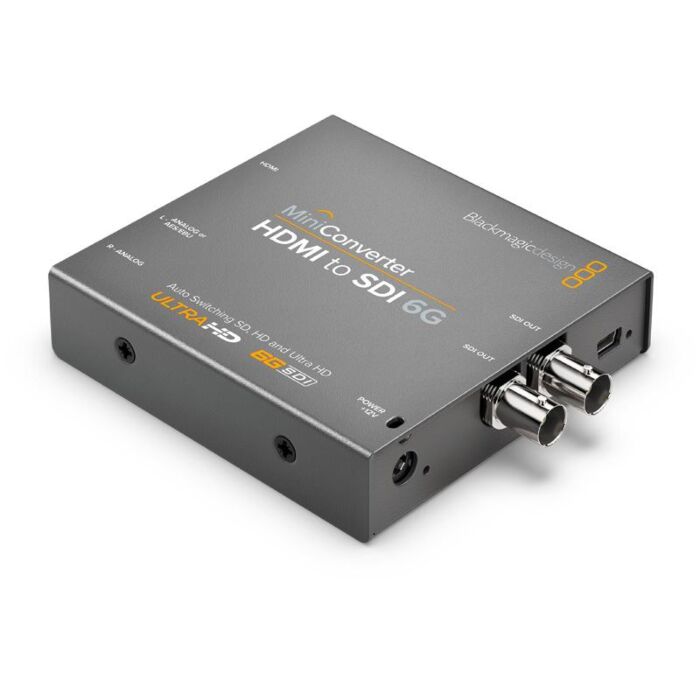 Mini Converter HDMI to SDI 6G includes everything you need to convert from HDMI devices to SDI video in SD, HD and Ultra HD video formats. With independent audio connections you can also embed SDI audio from HDMI, AES/EBU or balanced analog audio inputs. Mini Converter HDMI to SDI is the perfect solution to convert HDMI consumer cameras or computers to broadcast quality SDI.