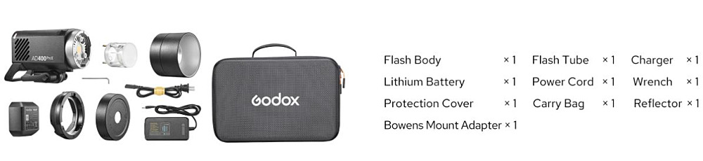 | Short Description | The Godox AD400Pro II is a powerful 400Ws battery-powered strobe designed for studio-quality lighting on location and in the studio. It delivers ultra-fast recycling, precise power control, and advanced wireless TTL compatibility with major camera brands. Equipped with a robust bi-color LED modeling lamp and universal modifier mounts, it's the ultimate tool for creative photographers.