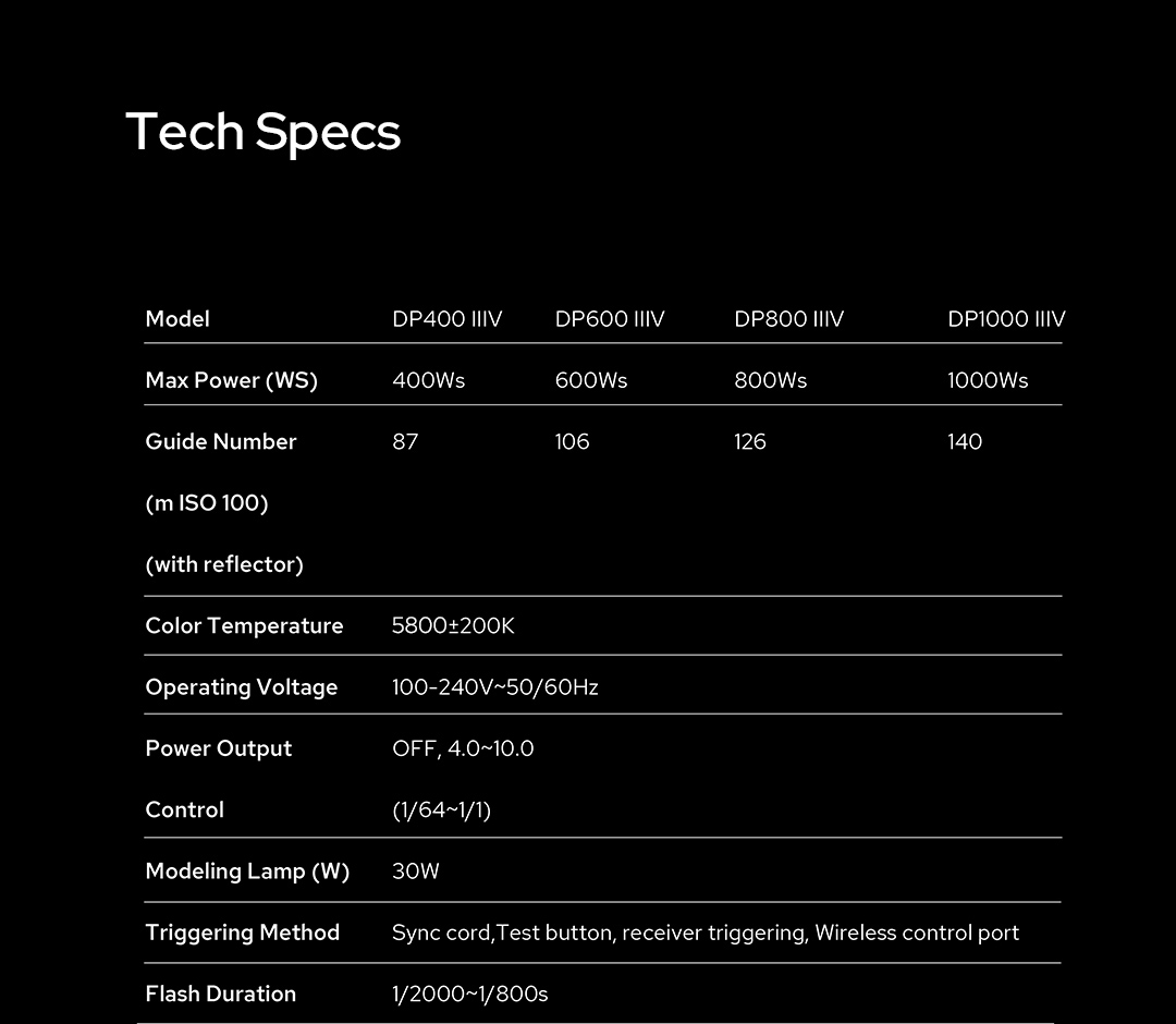 With flash durations ranging from 1/800th to 1/2000th of a second, the DP400III V excels in freezing motion and minimizing the chances of motion blur, making it ideal for dynamic subjects.