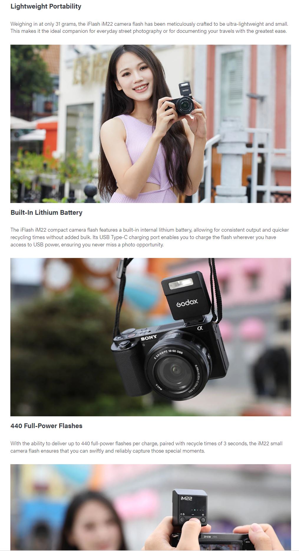 | Short Description | The Godox iFlash iM22 camera flash offers photographers unparalleled portability. Its ultra-compact and small size allows it to be easily thrown into a camera bag, handbag, or even your pocket while taking up minimal space. Features
