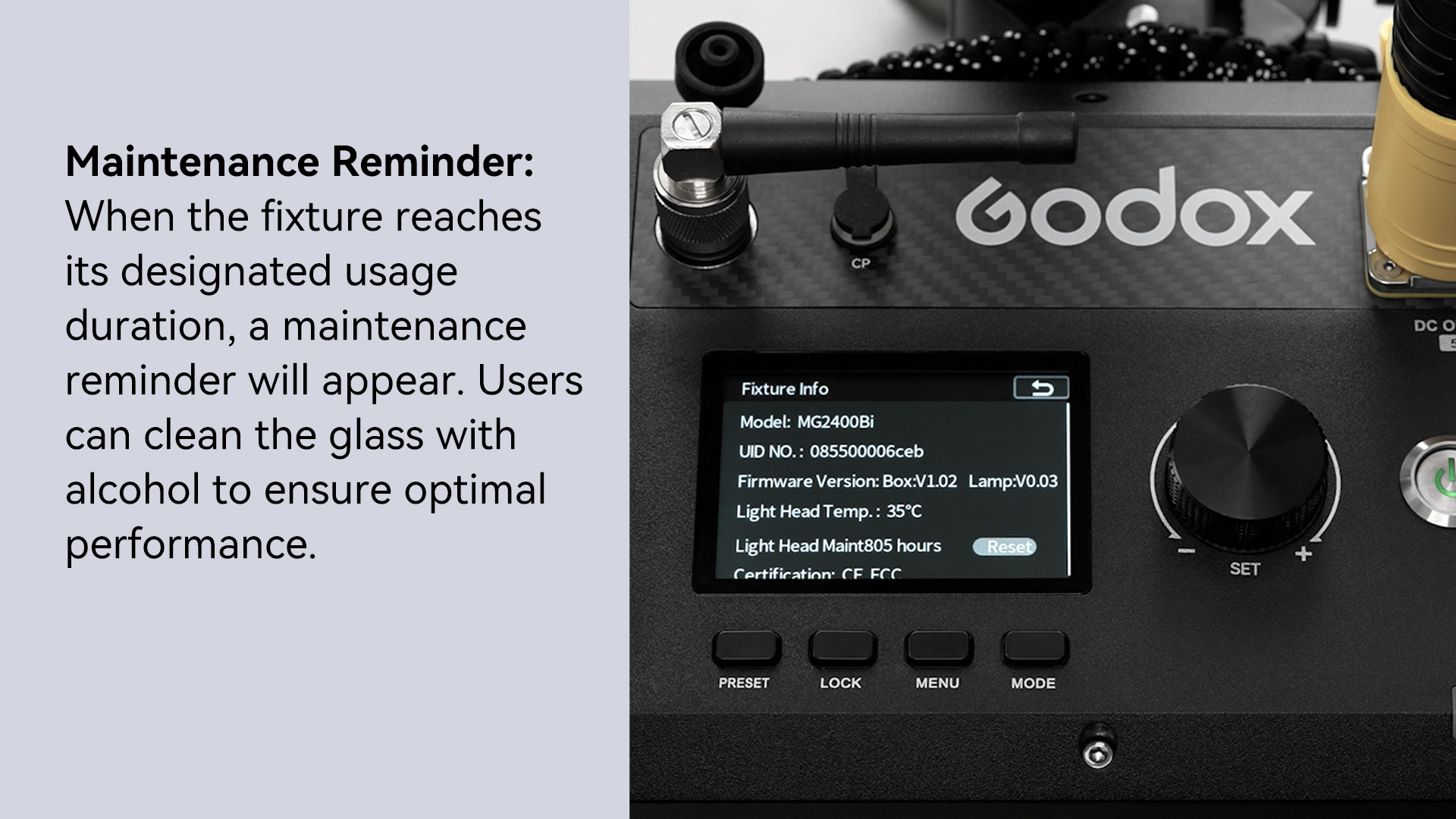 The MG2400Bi boasts class-leading blending technology, guaranteeing impeccable results. It delivers consistent and natural lighting, showcasing intricate and rich details of light and shadow. Through the use of advanced optical technology, it effectively manages heat buildup, reducing LED temperatures for enhanced color accuracy and an extended lifespan.