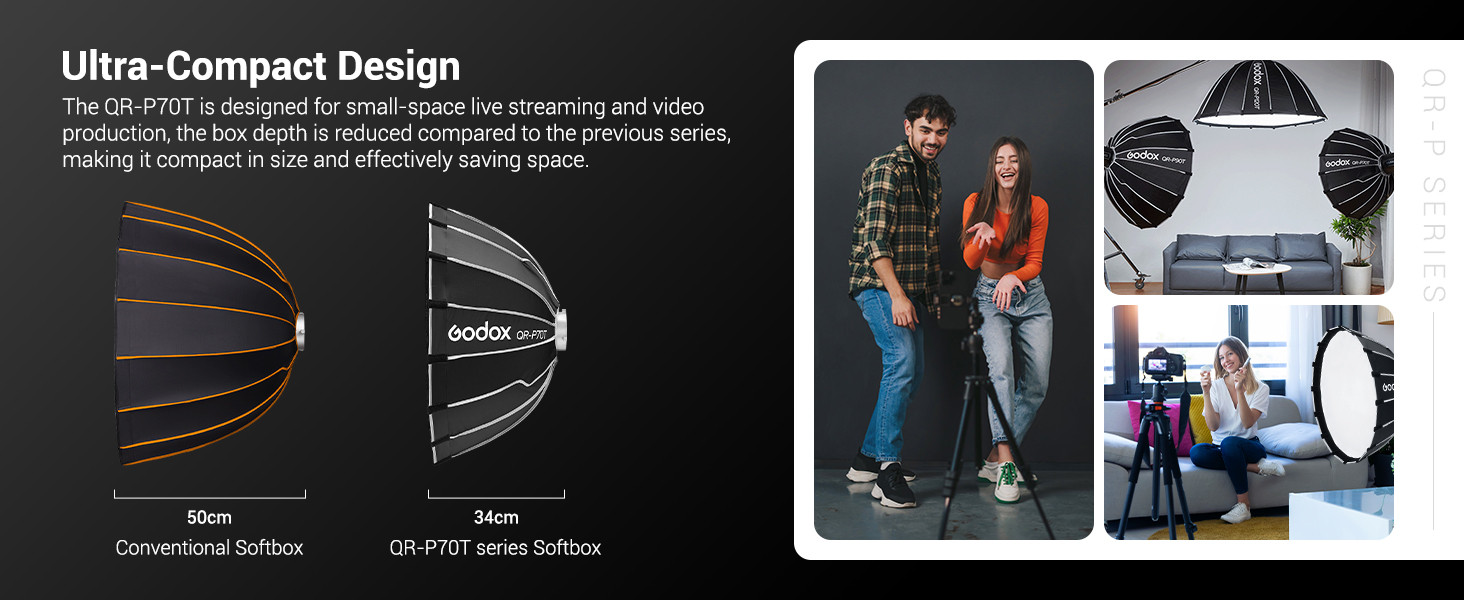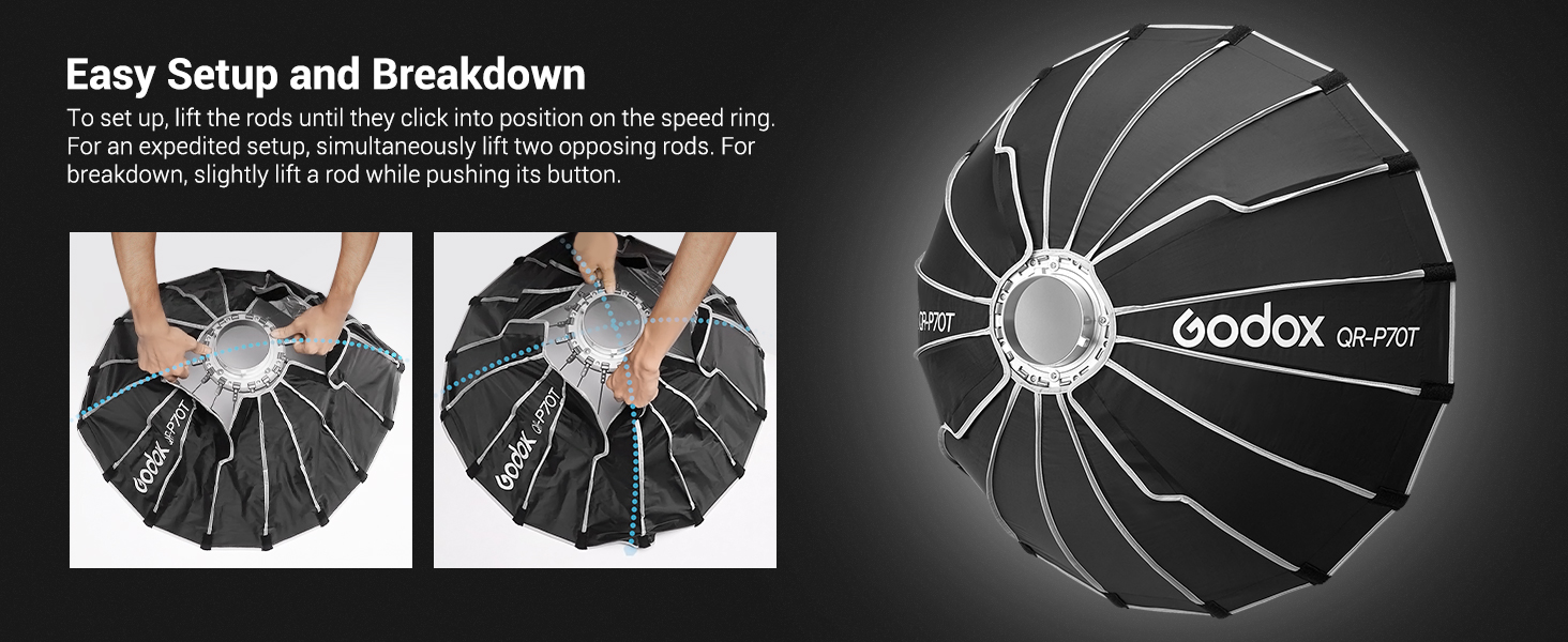 | Short Description | With the Godox QR-P70T Quick Release Parabolic Softbox with Bowens mount, you can start your photography sessions effortlessly. This softbox with a diameter of 70 centimetres is designed in such a way that you can quickly assemble it but can also quickly store it again. The parabolic shape provides a soft light with a defined sharp edge. To further refine your lighting effects, you can optionally add an optional grid