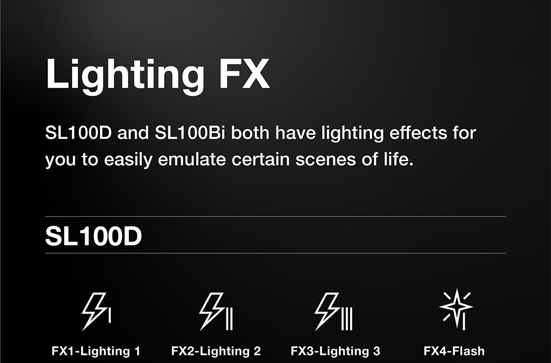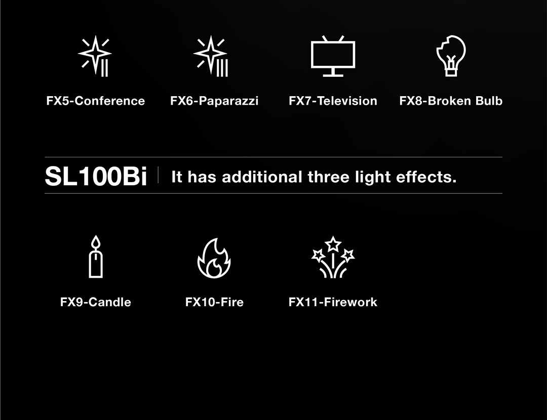 With 8 FX modes, the lighting possibilities become near endless. Featuring 3 modes of lighting intensity, 3 modes of flash photography intensity, television glows and an eerie broken-bulb like effect, the SL100D provides real-time post production to your project.