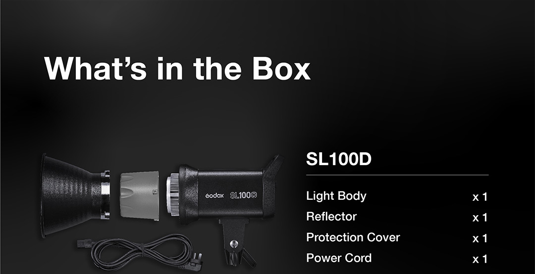| Short Description | The SL100D 100W Daylight Balanced LED Video Light from Godox is the perfect combination of a compact, economical professional LED light and impressive power. One of the most budget friendly continuous lights ever made, the SL100D has the capability of outputting 100W of daylight balanced power, equivalent to 32100 LUX @ 1m. Versatility in mind, the SL100D is designed to be incredibly robust in it's application, suitable for vloggers, video work, a quick-rig studio on a budget solution and more! The SL100D helps you build your audience with flicker-free, high quality lighting with a CRI/TLCI rating of 96/97+ Respectively. The SL100D can be controlled entirely via the Godox Lighting App which gives full access to it's 0-100% power range and 8 FX lighting modes.