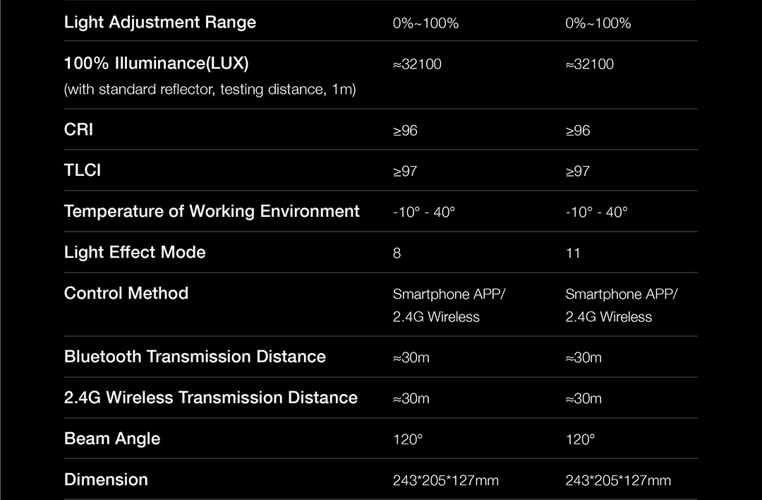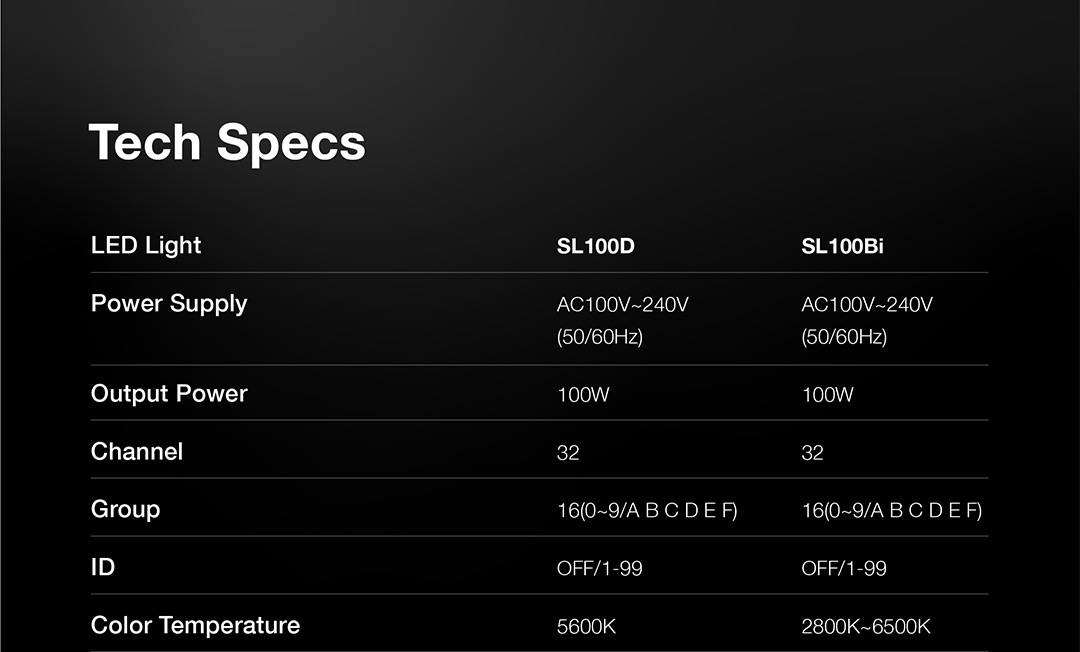 The SL100D offers 100W of pure power, equivalent to 32100 LUX @ 1m, perfect for lighting a small studio space or a focused scene.