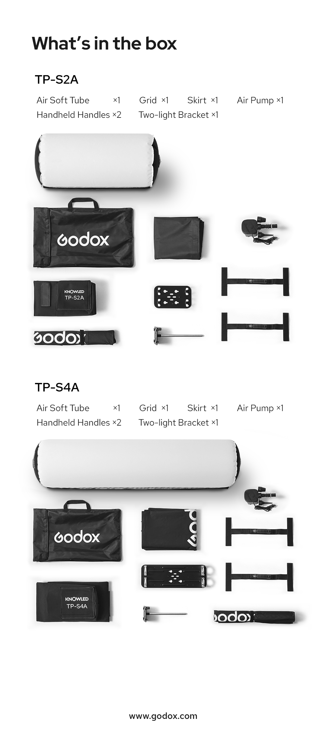 | Short Description | The Godox TP-S2A Air Soft Tube (diffuser)is an innovative lighting accessory designed specifically for use with up to two Godox KNOWLED TP2R Pixel Light Tubes (not included, available to buy seperately). By fully enclosing the light tubes, it transforms their output into a softer, more diffused quality of light, ideal for professional photography, cinematography, and theatrical productions. With a standard 5/8” Baby-Pin stand mount and an articulating head, it offers unparalleled versatility, enabling you to position your light exactly where you need it. |