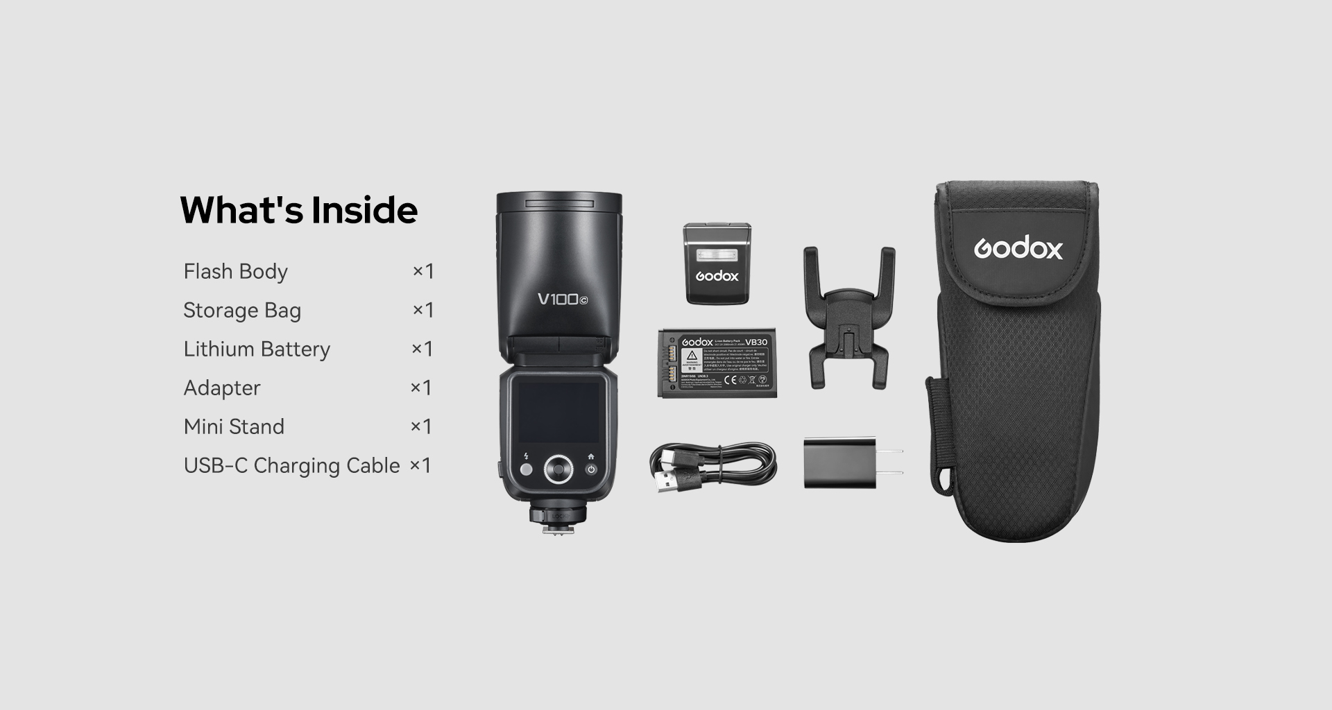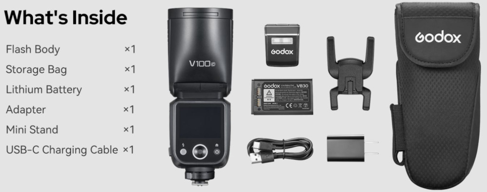 | Short Description | The Godox V100 C Speedlight Camera Flash is a versatile 100 Ws TTL flash offering power settings from 1/1 to 1/256. It supports global shutter sync speeds up to 1/80,000 s and can perform 70–100 full-power bursts without overheating. The flash includes a 2.3-inch touchscreen, integrated Godox X transmitter/receiver, USB-C port, and an LED modeling light. Compatible with a variety of accessories, it's ideal for portrait, sports, and event photographers. |