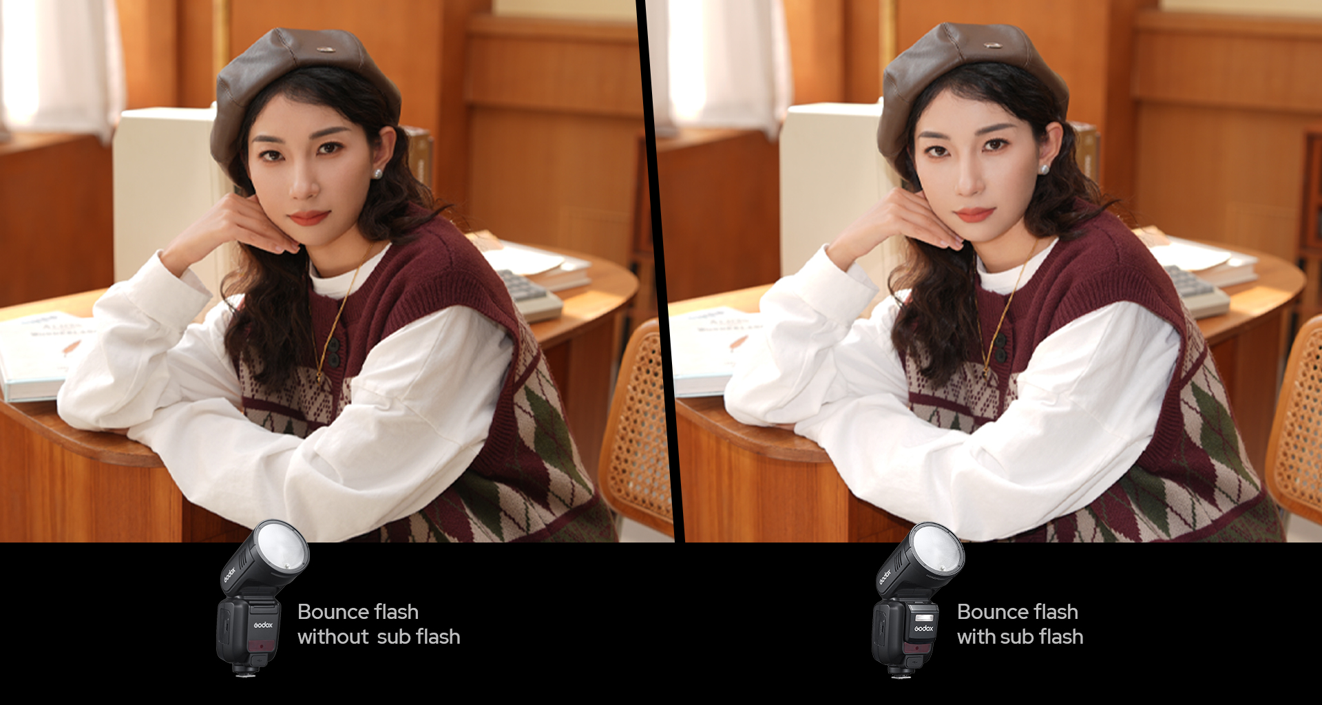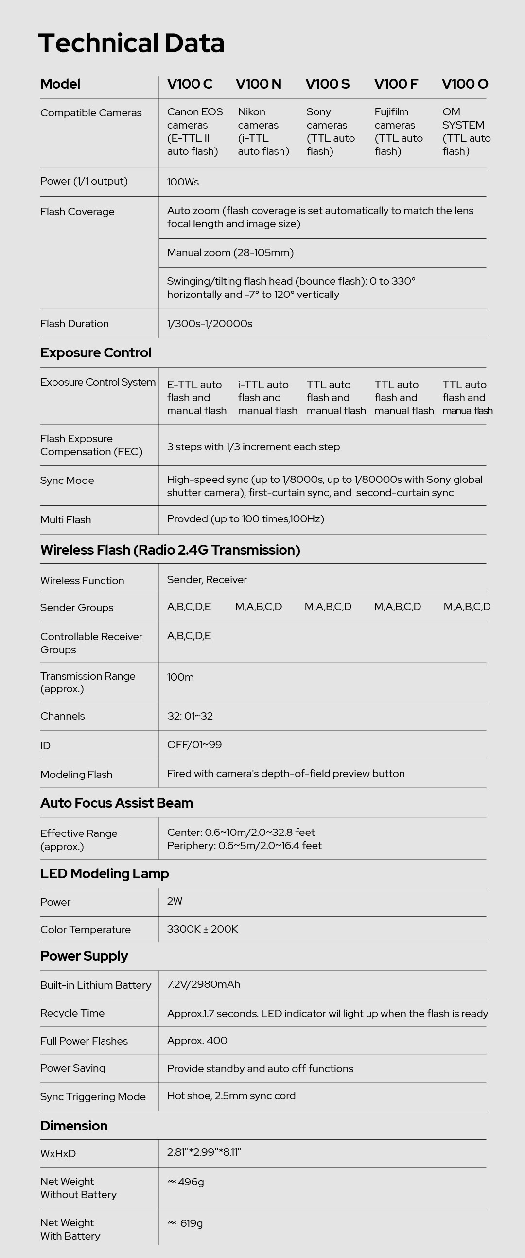 The V100 continues the highly praised detachable sub flash (SU-1) design from the V1 Pro. This versatile feature enables dual-light setups with a single flash, offering creative lighting solutions for portrait photography.