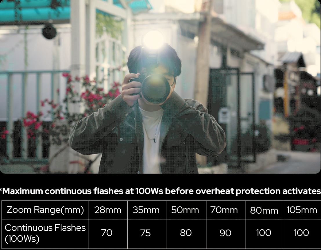 Its advanced cooling system, the V100 delivers 70 to 100 consecutive flashes at 100Ws without compromising performance. This ensures enhanced shooting efficiency and flexibility, allowing you to handle complex scenarios with ease and capture every brilliant moment of your creative vision.