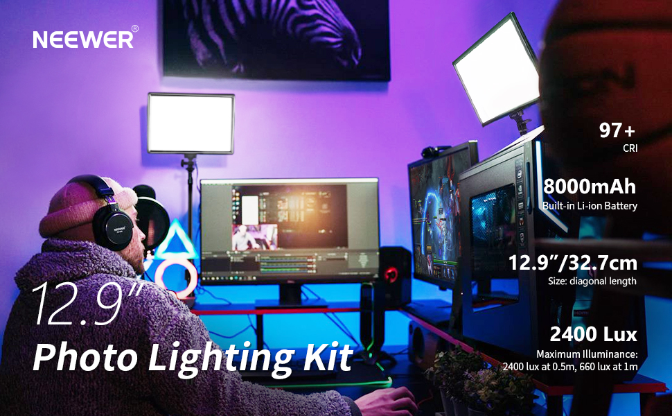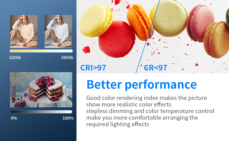 This Ultra-thin LED light panel has a 192 pcs energy-saving LED bead (96 Warm Yellow+96 Cold White); brightness from 0-100%; color temperature from 3200K to 5600K. Ultra-high CRI 97+ helps restore the true color more accurately.