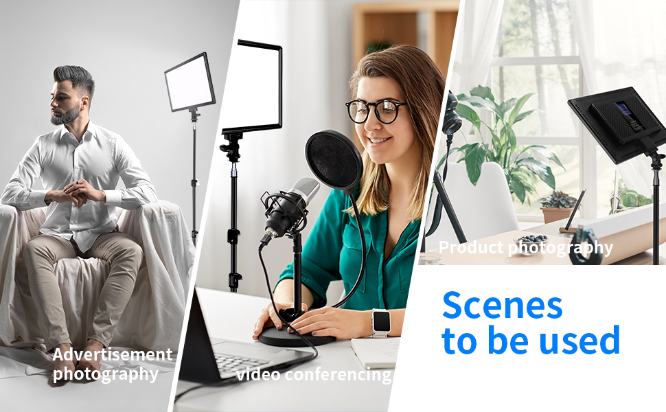 Equipped with a standard cold shoe and a 1/4 thread, it is compatible with any DSLR cameras, camcorders, tripods, and light stand, etc. Perfect for studio portraits, YouTube, interviews, advertisement photography, etc. Also suitable for video conferencing lighting, remote working, zoom calls, live streaming, etc.