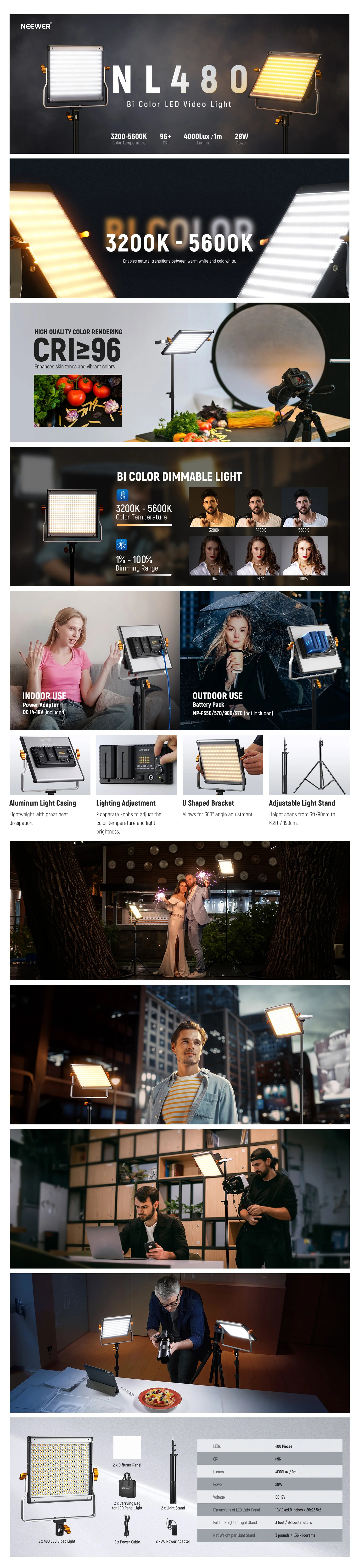 Powerful & Versatile Light- With 240 white and 240 yellow LEDs, each light will offer bright, continuous, and bi-color illumination for portraits, product photos, youtube vlogs, video gaming, and online meetings. The ultra high CRI96+ ensures natural and vivid color reproduction for all your creation/