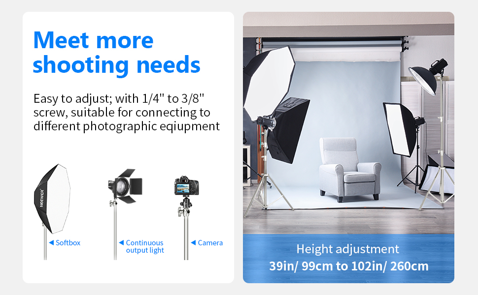| Short Description | Spring Cushioned Heavy Duty Stand- The built-in spring cushion protects your equipment, perfect for mounting LED video lights, ring lights, monolights, strobes, softboxes, reflectors, and other photography gear. Load Capacity: 22lb / 10kg |