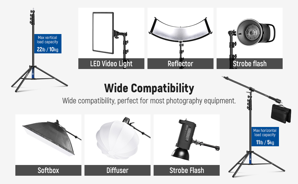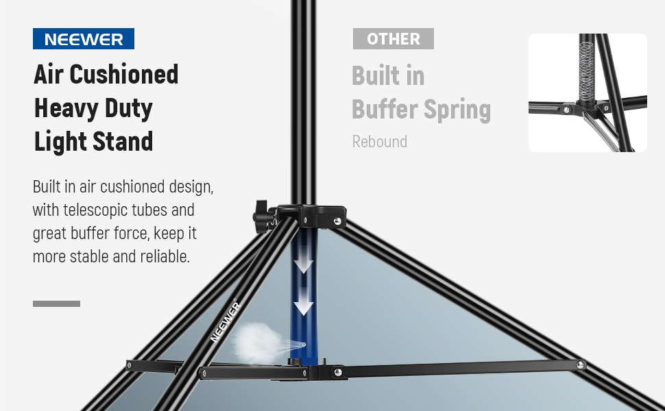 - 9.8ft Air Cushioned Light Stand- With upgraded air cushion design, sturdy metal build, the 9.8ft height adjustable light stand provides exceptionally stable support for your photography devices. Compared with a traditional spring-loaded stand, the air-cushioned light stand protects your equipment from abrupt drops, minimizes shakes, and avoids finger pinches when adjusting stand height. Max vertical load capacity: 11lb/5kg