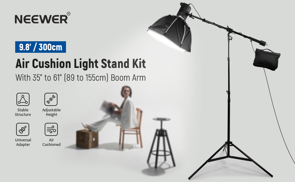 | Short Description | NEEWER Air Cushioned Aluminum Light Stand, 9.8ft/3m Adjustable Photography Stand with Boom Arm, Counterweight, Sandbag, 1/4" Screw for Softbox, Studio Light, Flash, Umbrella, Ring Light, Max Load 5kg |