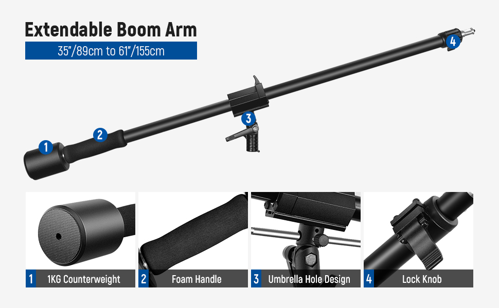 - 5.1ft Extendable Boom Arm- The stand comes with a 35"/89cm to 61"/155cm extendable boom arm. Connect the arm to the stand via the middle joint, then freely swivel and tilt the arm for different angles. Secure with separate tilt, pan, and arm lock knobs. One end of the arm features a comfortable cushioned grip while the other end has a stainless steel 1/4" threaded screw to connect other devices. Max horizontal load capacity: 11lb/5kg