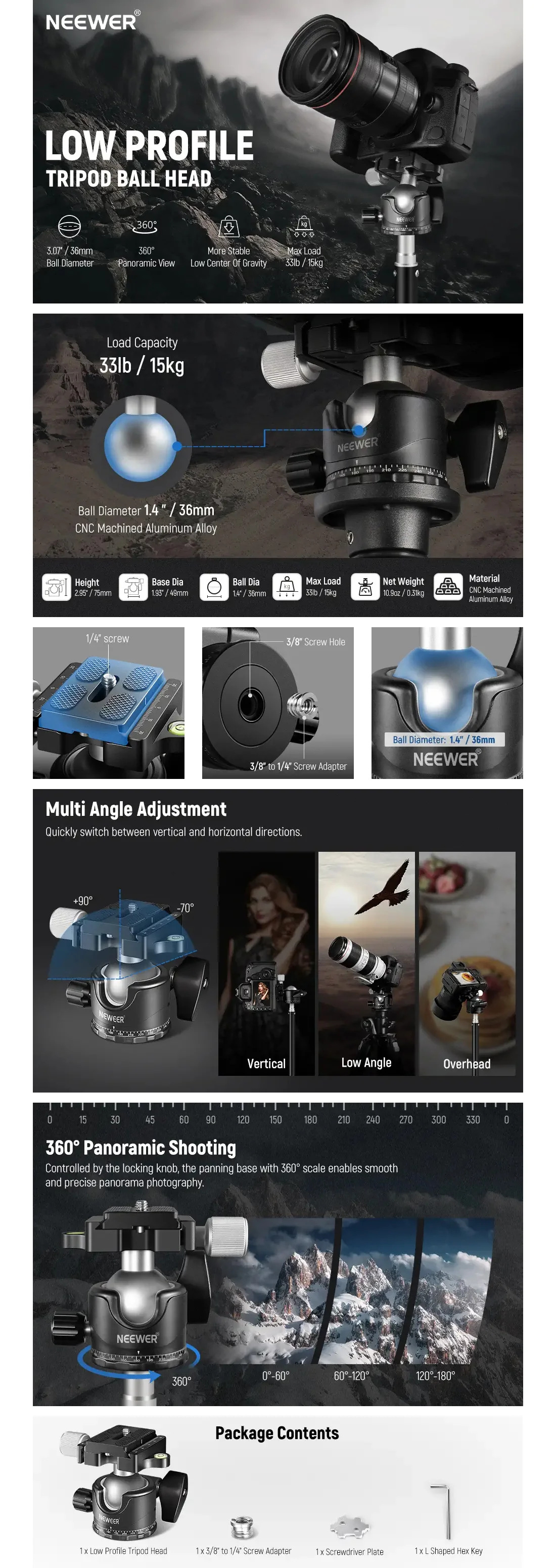 | Short Description | NEEWER 36mm Metal Panorama Low Profile Camera Tripod Ball Head Low-Center-of-Gravity Tripod Head is a durable, all-metal ball head that mounts your DSLR camera, mirrorless camera, and camcorder of up to 33lb (15kg). The 36mm ball diameter ensures extra stability and smooth positioning of your equipment. The 38mm Arca quick-release plate lets you attach and swap cameras safely and rapidly. The 1/4? mounting screw is widely compatible with most photographic devices with non-slip rubber pads to avoid scratches. |