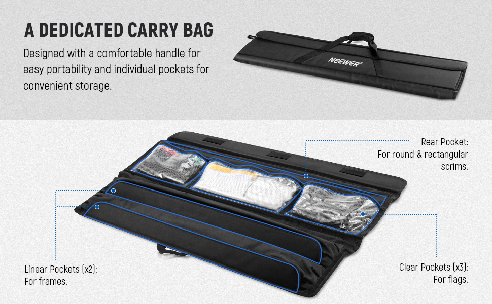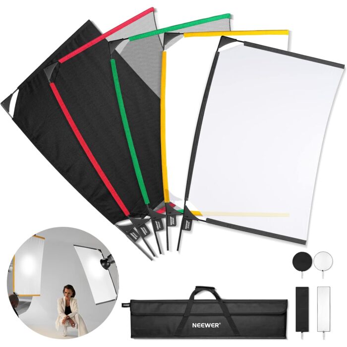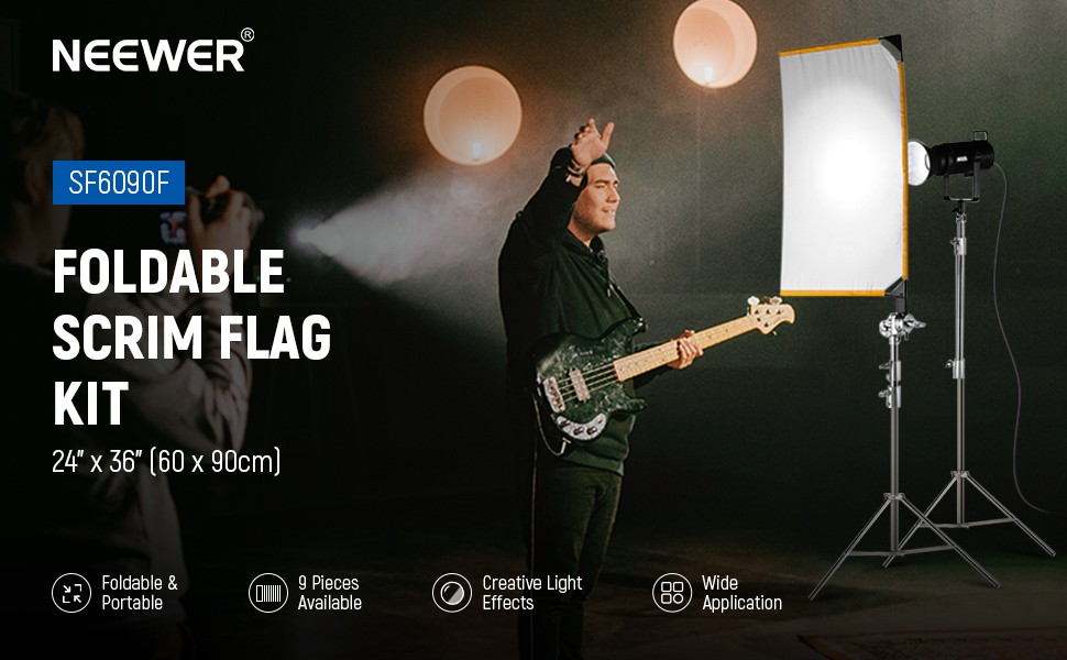 | Short Description | NEEWER 5-in-1 24x36in Foldable Scrim Flag Kit comes with five detachable metal frames, five 24"x36" (60x90cm) photography flags, and four round / rectangular shaped scrims, this versatile light modifier kit allows photographers to combine the accessories and shape lights with unlimited creativity. The foldable frames and lightweight fabrics also make this kit easily portable. |