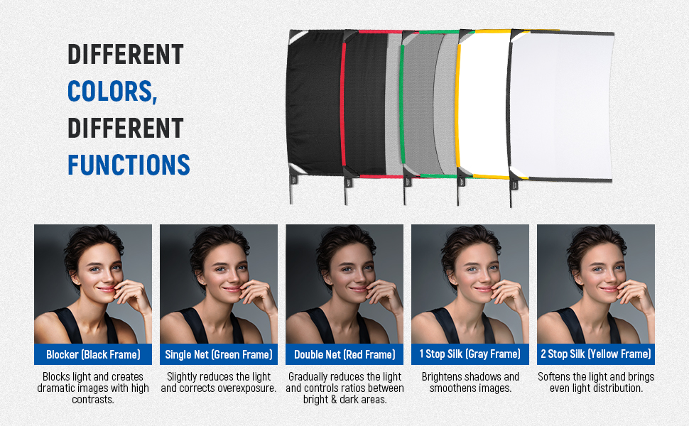 Uniquely Functional Color Frames- Each flag comes with a distinctive color frame that represents its unique function. The black frame (blocker) creates hard lighting with high contrast for images. The green (single net) and red (double net) frames reduce the light and modify the ratio between bright and dark areas. The gray frame (1 stop silk) can brighten shadows and smoothen the light transition. The yellow frame (2 stop silk) softens and diffuses the light.