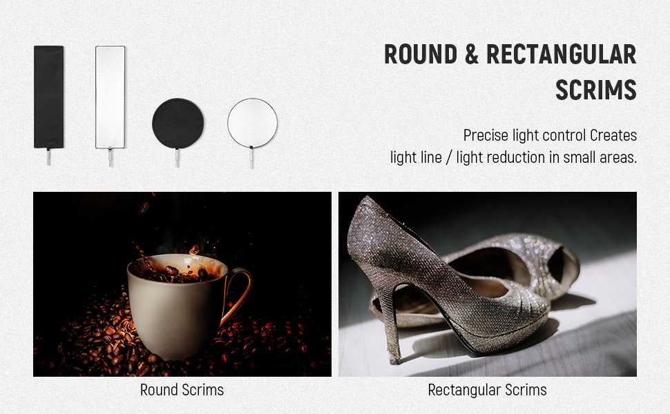 Round & Rectangular Shapes- Two ø6" (16cm) round scrims (dots) and two 4"x14" (10x35.5cm) rectangular scrims (fingers) are suitable for small shooting environments. Their function is to finely adjust the light positions and prevent reflection, allowing photographers to accurately control the light and create dark shadows as well as bright highlights.