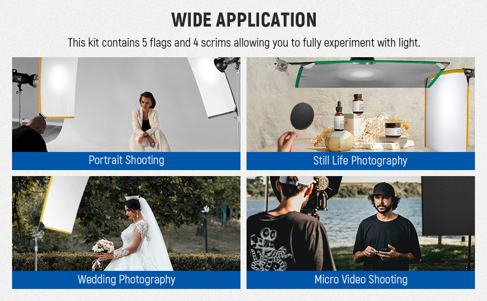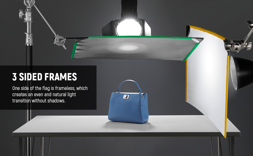 Comprehensive Light Shapers- Foldable flags serve to reduce, diffuse, and block light sources. Used by photographers for dramatic light contrast and precise control over light output and achieve sublime, creative light effects with ease. One side of the flag is frameless, which creates an even and natural light transition without shadows.