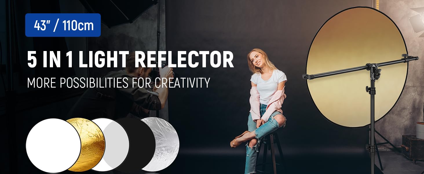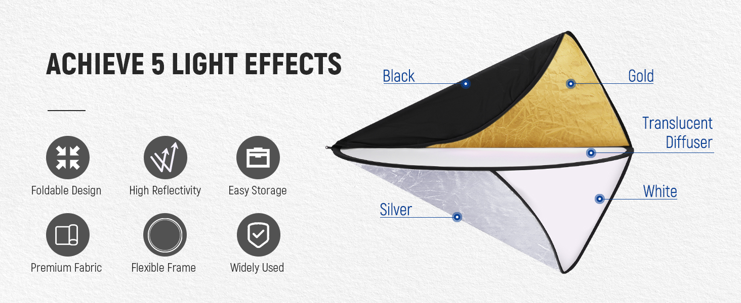 - This Neewer 5-in-1 Collapsible Multi-Disc Light Reflector with Bag Silver Gold White & Black.