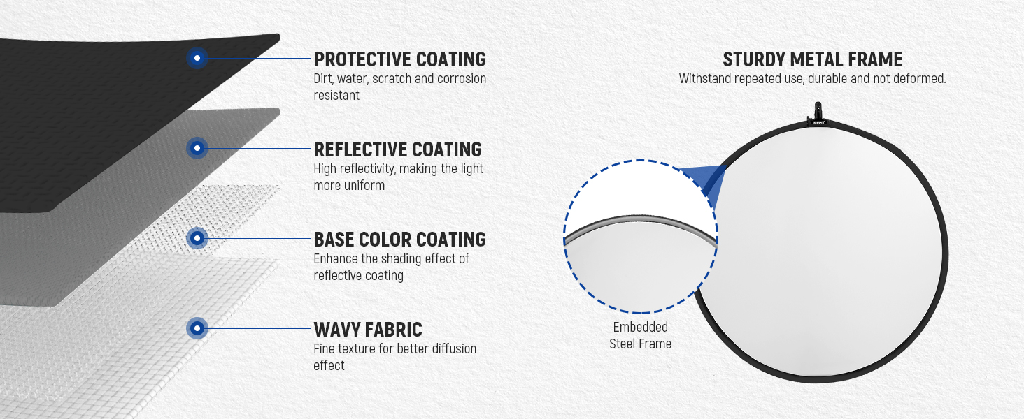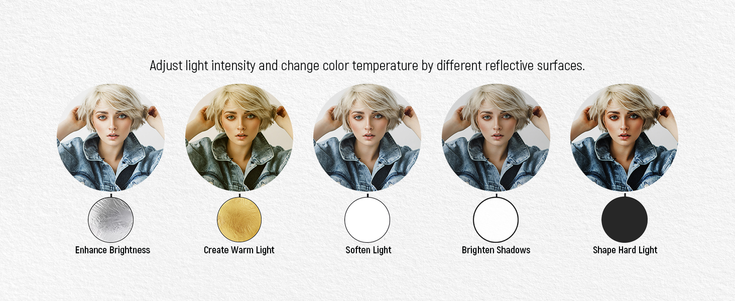 - Comes with silver, gold, black, white, and translucent reflectors.