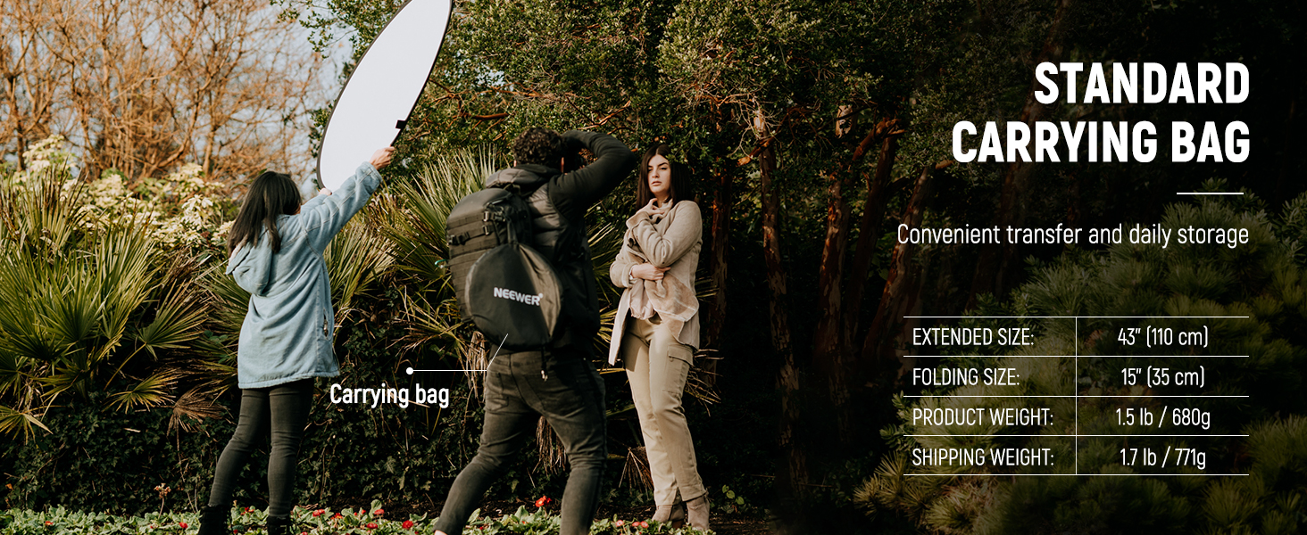 | Short Description | This Neewer 5-in-1 Collapsible Multi-Disc Light Reflector with Bag Silver Gold White & Black. Comes with silver, gold, black, white, and translucent reflectors. These are the most popular reflectors for photography. |