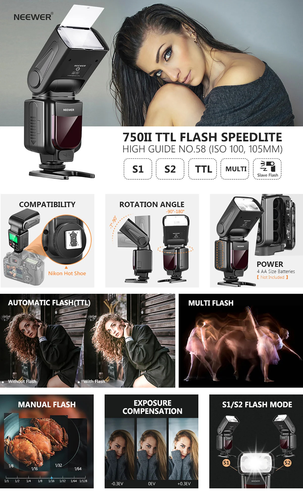 | Short Description | NEEWER 750II TTL Speedlite Flash For Nikon DSLR Cameras - Powerful Flash with High Guide No. 58 (m) / 190ft(at 105mm focal length,ISO 100 in meters/feet). Charging socket for external power pack: adds a charging socket for external power pack. PC synchronous port: simple for you to use the PC synchronous line. |