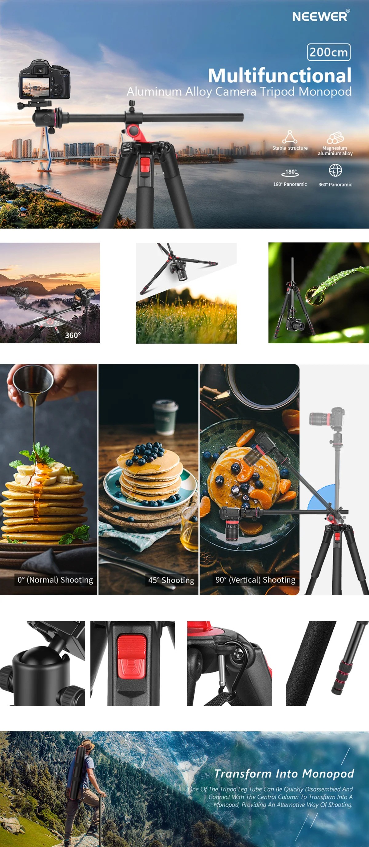 Transform Into Monopod- One of the tripod leg tubes can be quickly disassembled and connected with the central column to transform into a monopod, providing an alternative way of shooting; The height of the monopod is adjustable from 21.7" to 61"/ 55cm to 155cm.