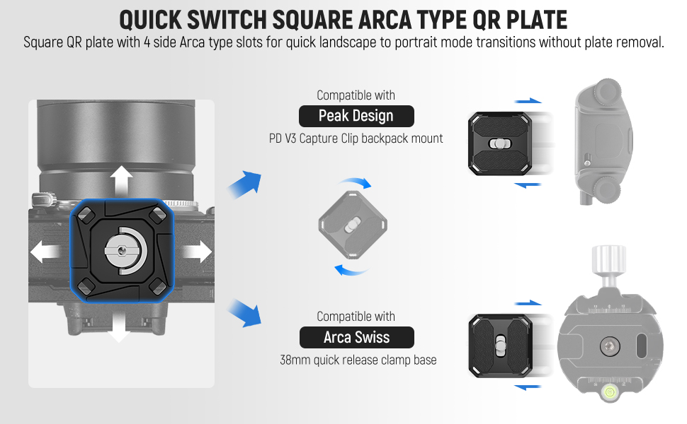 Triple Compatibility Quick Switch QR Plate- Compatible with Peak Design Capture Camera Clip V3 backpack strap clip mount compatible with Arca Swiss 38mm plate clamp base compatible with Ulanzi F38 compatible with Falcam F38 backpack shoulder strap gimbal stabilizer mount. Effortlessly mount your camera on a tripod, monopod, slider or stabilizer with identical mounting systems, and enables quick swap between a backpack strap, compatible with Peak Design travel tripod