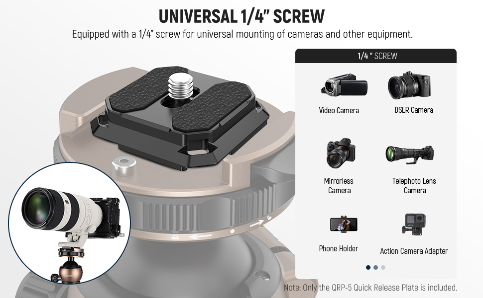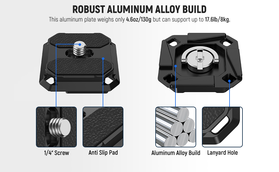 Non Slip Rubber Pads- Two anti slip rubber pads on the plate add friction, increase stability, protect your camera against scratches and prevent unwanted vibrations while shooting