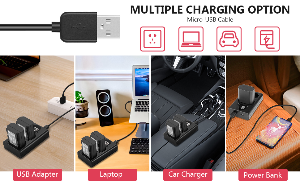 - MULTIPLE CHARGING OPTION: Charge with a USB wall charger, cellphone charger, car charger, laptop or power bank gives you more options than a standard battery charger; Recharge inside the camera or with a 2.1A input charger for optimal charging