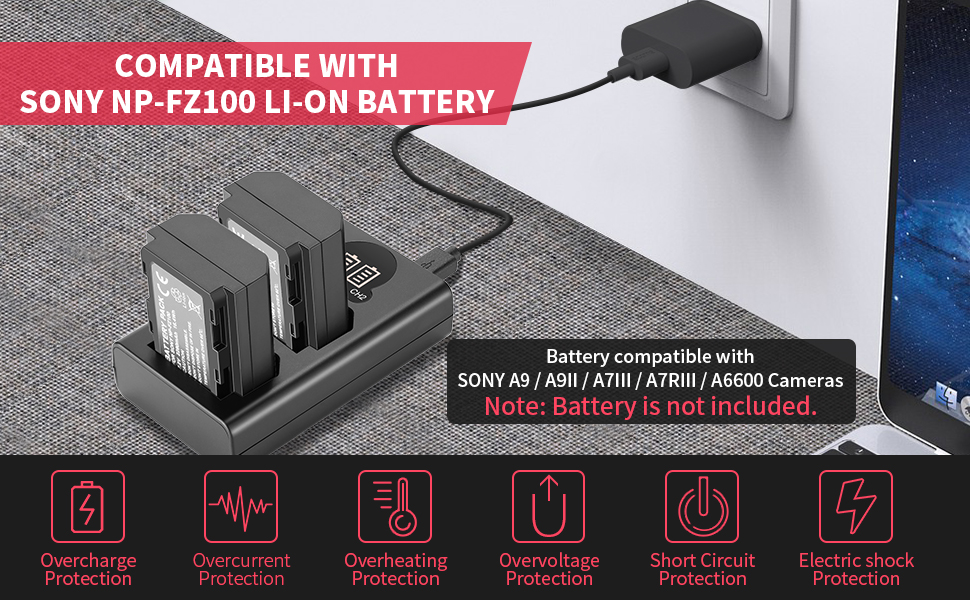 - COMPATIBILITY: 100% compatible with Sony NP-FZ100 Li-on Battery. Compatible with Sony ZV-E1, FX3, FX30, A1, A9, A9 II, A7R III, A7R IV, A7R V, A7S III, A7 III, A7 IV, A6600, A7C Cameras; It can charge 2 packs NP-FZ100 batteries at same time, also can charge 1 battery; Note: Battery is not included