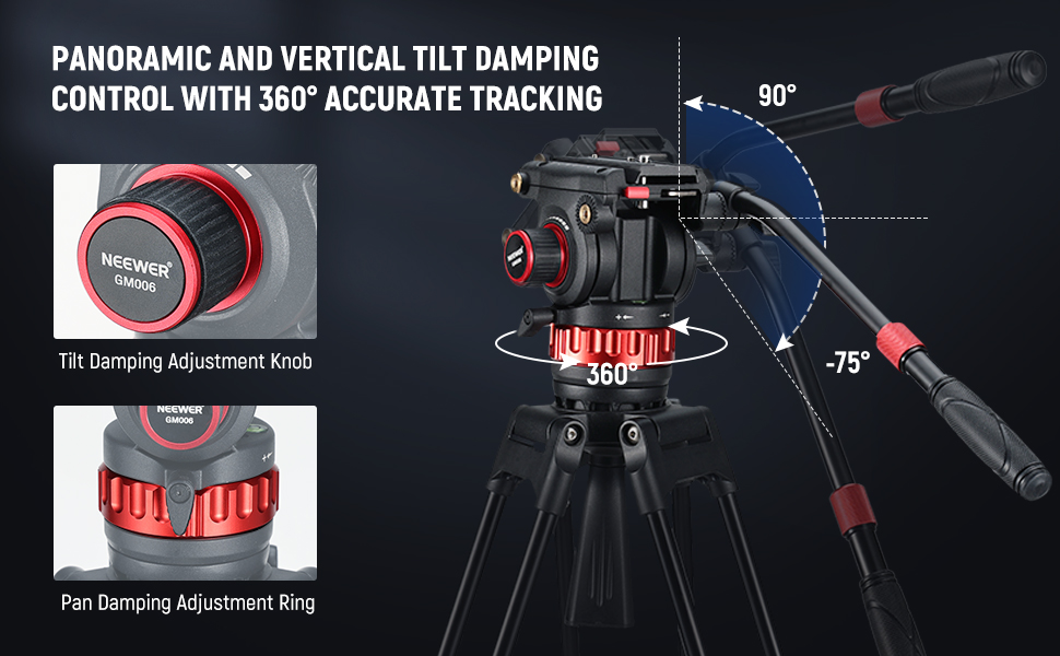 Plus Definable Vertical Tilt Damping- Use the side knob to adjust the appropriate damping according to the weight of the loaded equipment, and easily achieve +90°/-75° up and down shooting motion. Even if the handle is released, the lens will not drop suddenly, but slide down slowly, always maintaining a dynamic balance. Whether it is low angle, overhead or vertical, you can get stunning works.