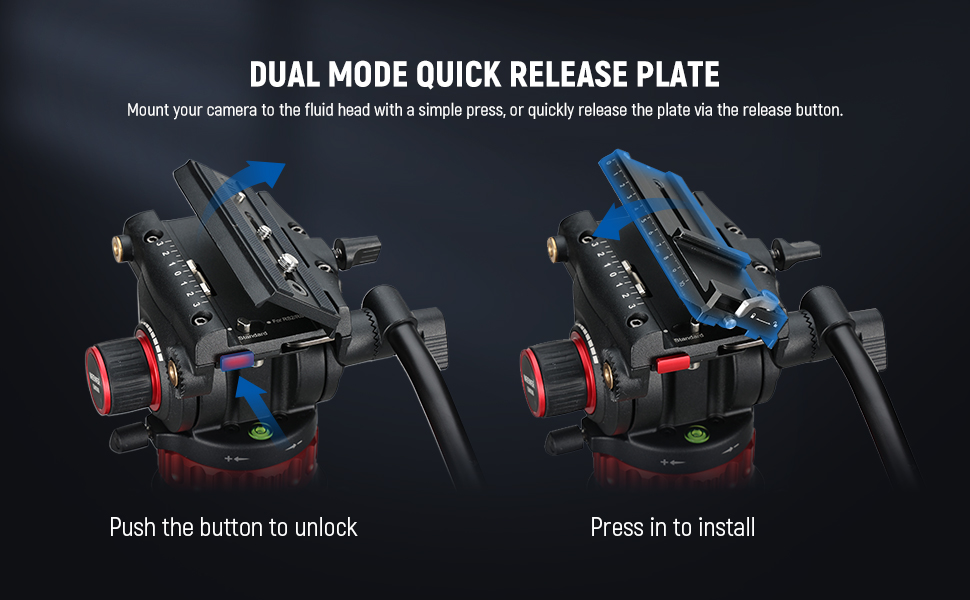 Quick & Easy Switching Modes- The fluid head has two QR modes, compatible with DJI RS2 RS3 RS3 PRO gimbal and Manfrotto 501PL 504PL quick release plates respectively. Compared to the traditional slide in structure, you can press the quick release plate directly from the top of the fluid head and lock it in 1s, as well as quickly release the plate via the release button, more efficient and convenient to switch between tripod and gimbal shooting.