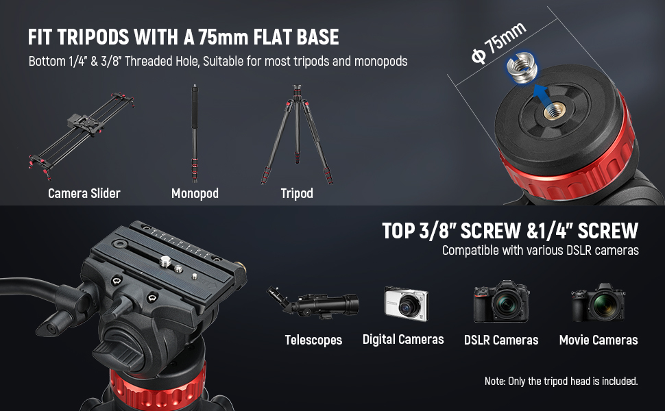 | Short Description | Professional Heavy Duty Yet Compact Drag Head- Made of premium aluminum alloy and weighing only 3.1lb/1.4kg, this heavy duty fluid head is exceptionally robust and can withstand harsh outdoor environments, and offer a maximum load capacity of 22lb/10kg for a firm grip on your heavy camera. The ?75mm flat base with a 3/8" threaded hole can be attached to a tripod, monopod, or camera slider, and a built in magnetic L shaped hex key to secure your camera without extra tools |