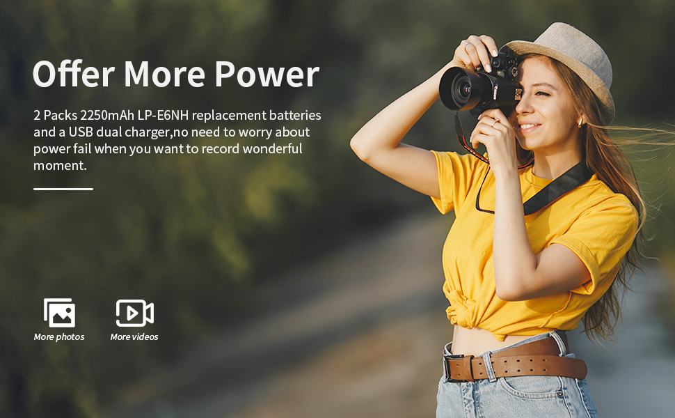 2 Packs 2250mAh LP-E6NH Replacement Batteries and a USB dual charger; Offer more power, no need to worry about power failure when you want to record a wonderful moment.