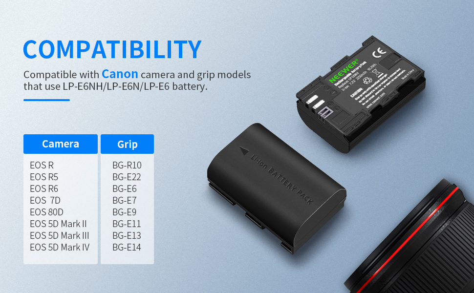 Compatible with Canon camera and grip models that use LP-E6NH/LP-E6N/LP-E6 battery, such as compatible with Canon EOS R7, EOS R5, EOS R6, EOS R, EOS 5D Mark IV, 5D Mark III, 5DS, 5DS R, 5D Mark II, 6D, 6D Mark II, 7D, 7D Mark II,90D, 80D, 70D, 60D, 60Da, BG-R10, BG-E22, BG-E6, BG-E7, BG-E9, BG-E11, BG-E13, BG-E14