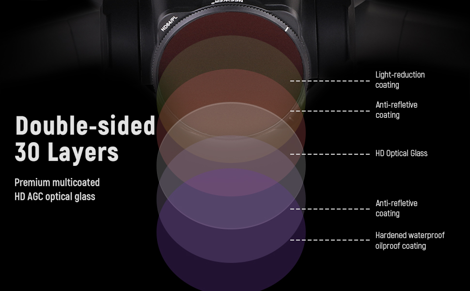 Multi-Coated Optical Glass: 30-layer multi-coated optical glass lens filters ensure crystal clear footage. The coatings are water-resistant, oil-resistant, and scratch-resistant, reducing lens flares and reflections
