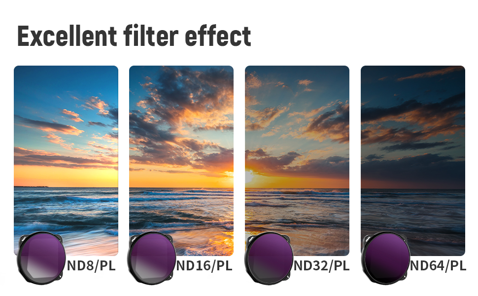 Reduced Light & Greater Control: The ND8, ND16, ND32, and ND64 filters reduce light by 3, 4, 5, and 6 stops respectively. Select a filter to reduce different amounts of light, enabling you to slow down shutter speed and prevent overexposure, giving you more control over your shots
