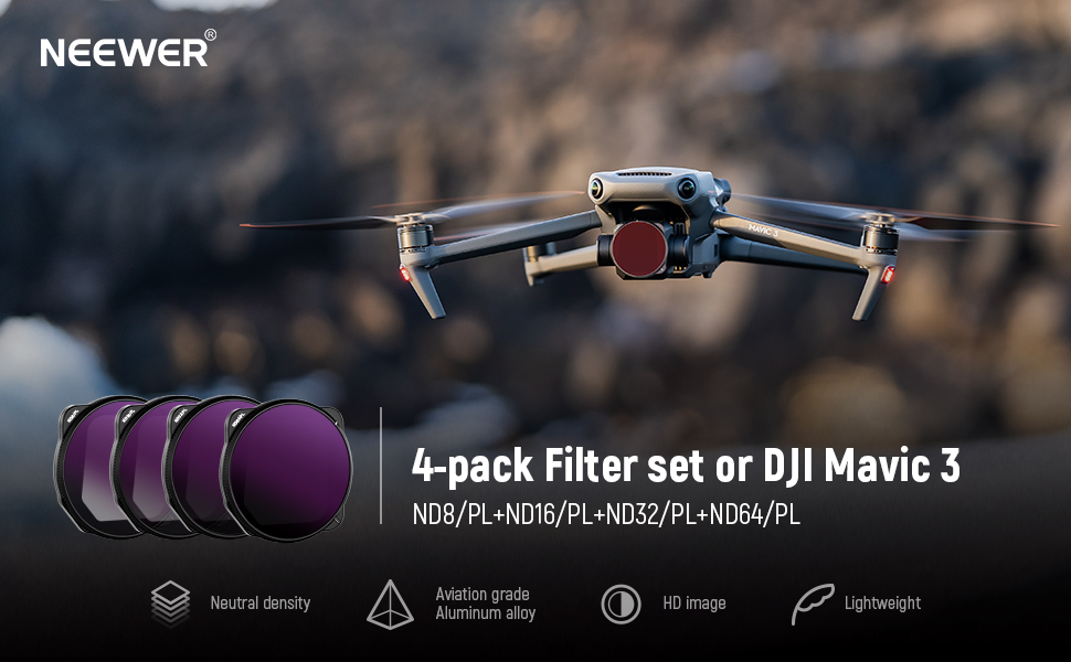 | Short Description | Neewer ND Lens Filter Set for DJI Mavic 3 is designed for the Mavic 3 and Mavic 3 Cine drone to help reduce light entering lens and achieve various effects. The aircraft-grade aluminum alloy frame uses a lightweight design and the filters weigh 0.19oz/5.4g. The lightweight frame and HD optical glass works with Mavic 3 gimbal with no calibration issues. |