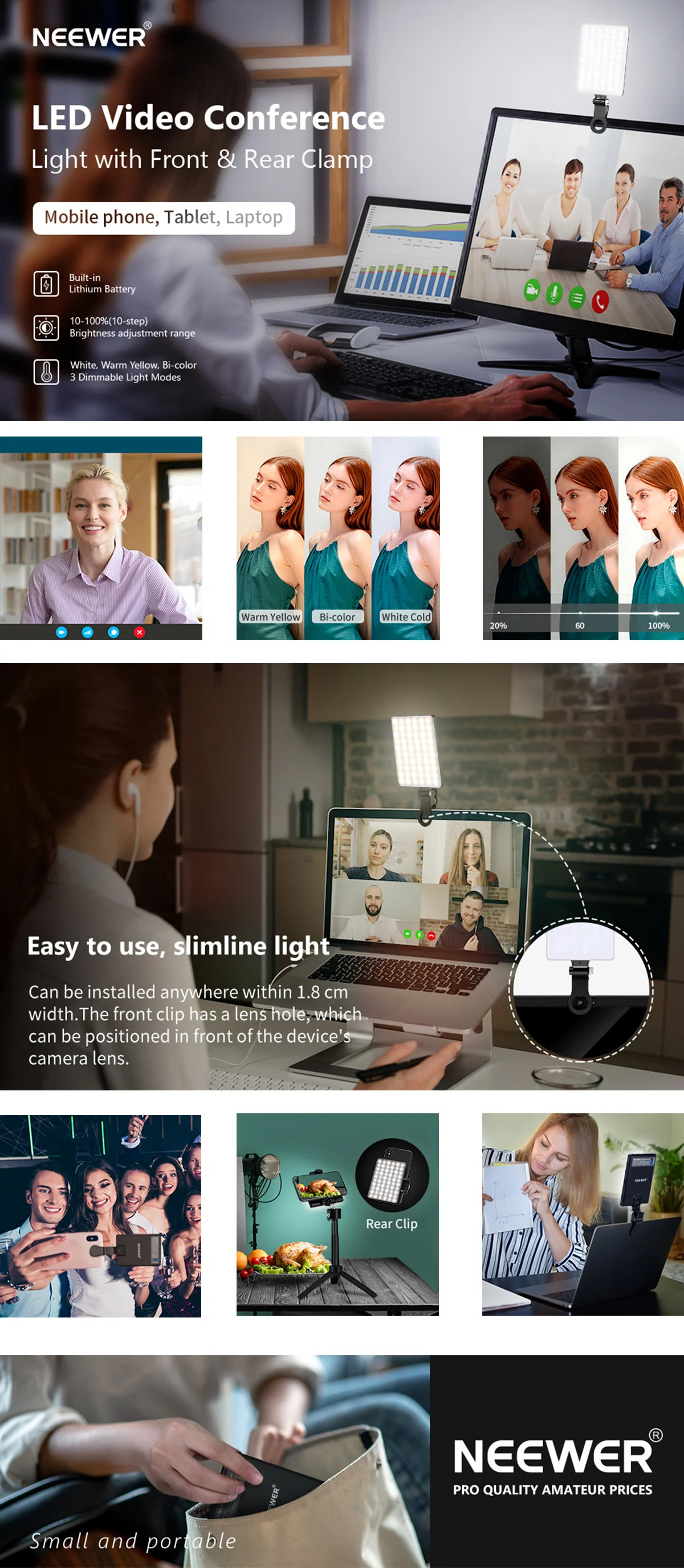 | Short Description | This slim and lightweight LED light will brighten up your appearance so you look your best in front of the webcam—whether you are attending a Zoom meeting, live streaming on social media, or shooting a vlog for your YouTube channel. The high CRI rating of 95+ gives you a natural, smooth, and radiant skin tone |