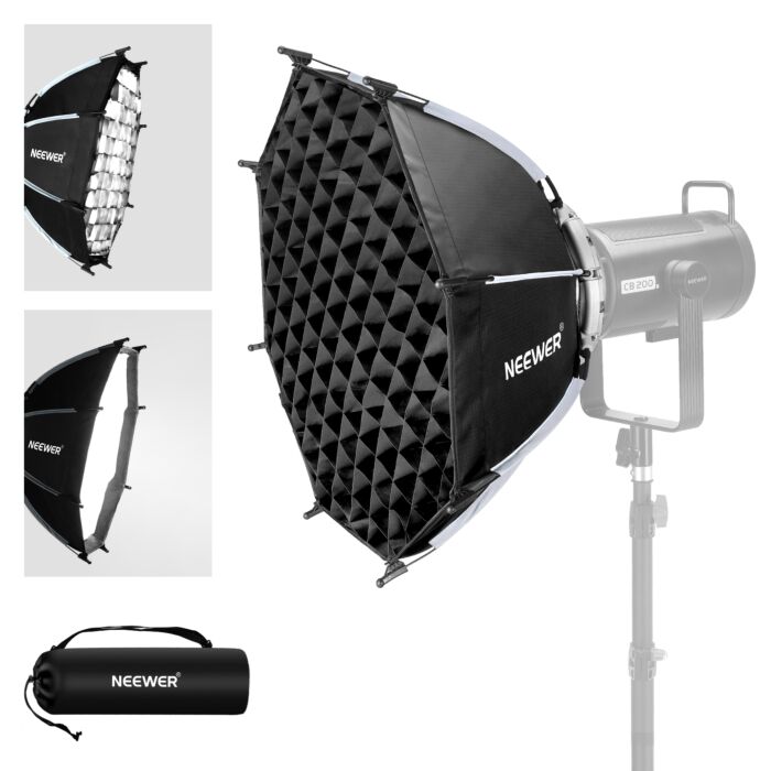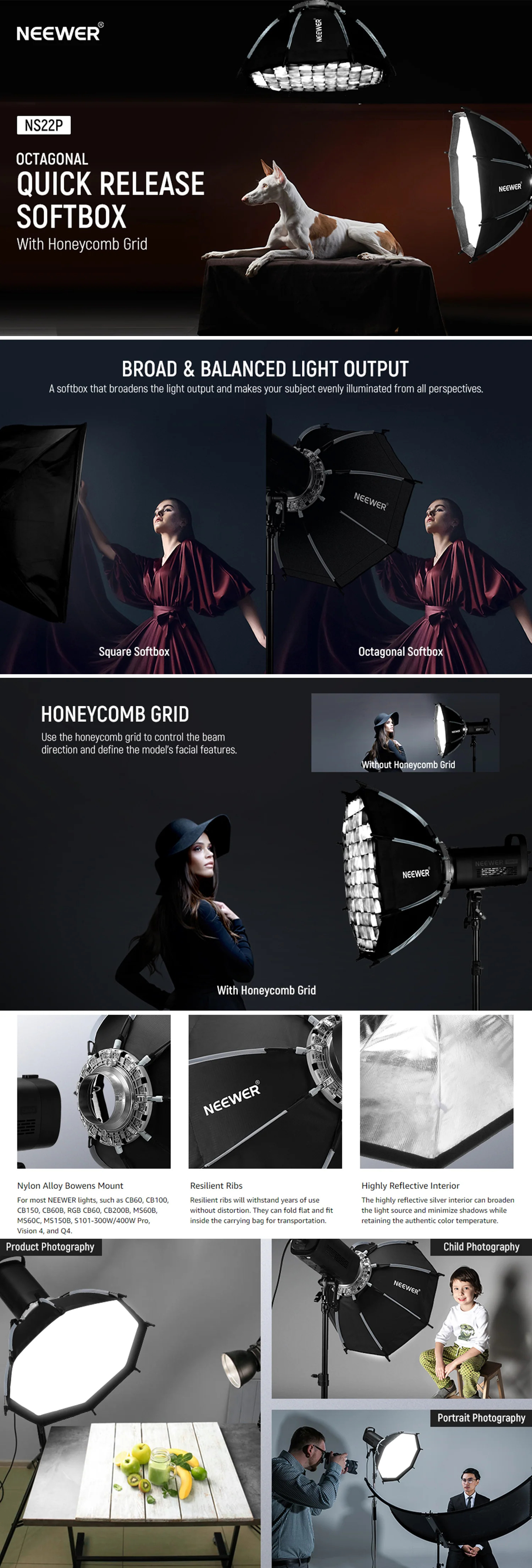 - Premium Octagonal Softbox- Elevate your portrait, weddings, fashion photography, video recording, live streaming, and interviews with this 22"/55cm essential octagonal softbox. Silver interiors intensify light source while maintaining true color. Includes diffusers and a grid for softening glare and eliminating shadows. Lightweight (1.7lb/0.75kg) with a nylon alloy chuck structure and a carrying bag for outdoor portability