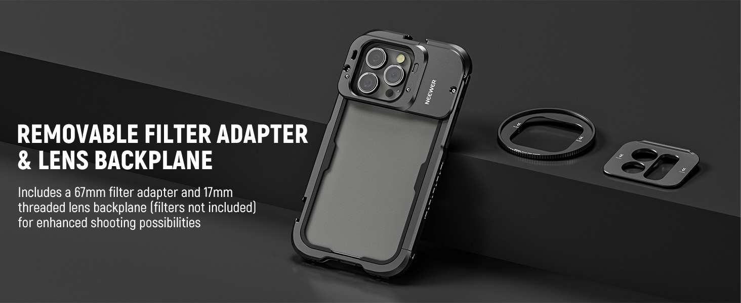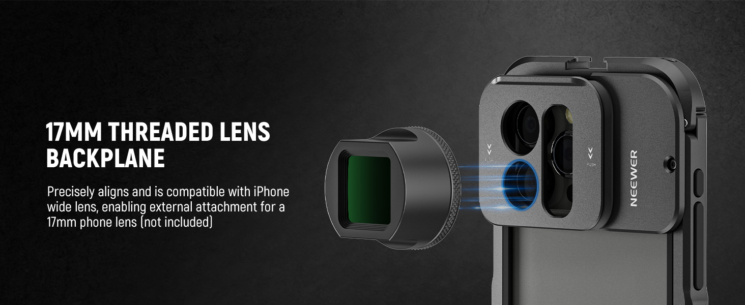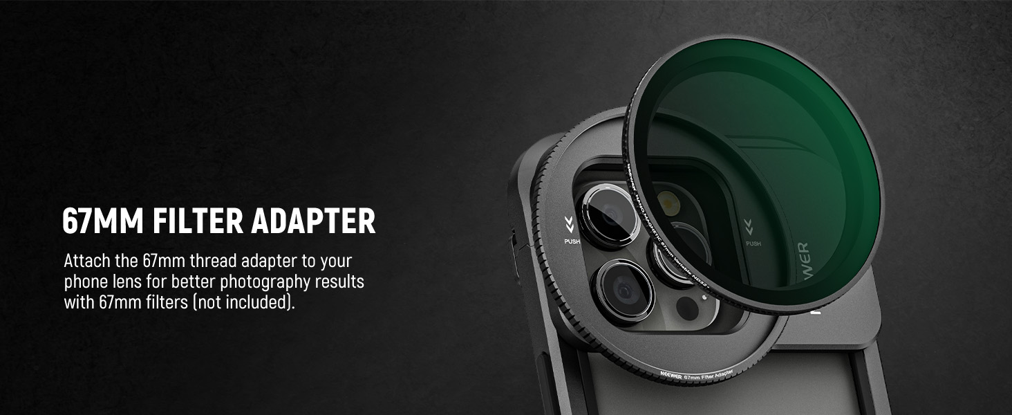 Installation and removal take just one second — align the two snap points and press to install. Elevate your phone photography and videography by attaching ND, CPL, UV, or effects filters with the 67mm filter adapter. The 17mm threaded backplate is compatible with iphone lens attachments, such as a 10X wide angle phone lens, 8mm fisheye lens, 300X microscope close up lens, or 6X telephoto lens for versatile shooting with the 48MP main camera (lenses and filters not included).