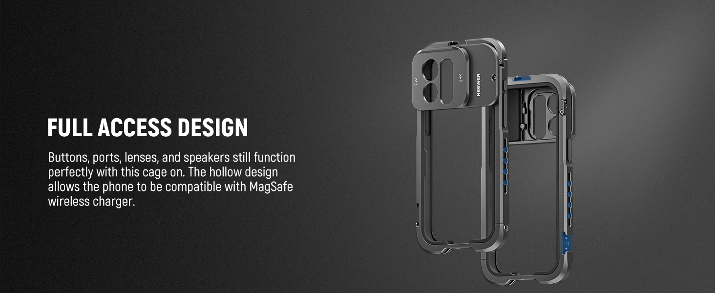 No assembly needed. Open the cage with the quick release button, insert the phone, and lock. Precise design gives full access to buttons, ports, speakers, and lenses. The hollow back is compatible with MagSafe wireless charger MagSafe battery pack and PA010 Magnetic Phone Holder.