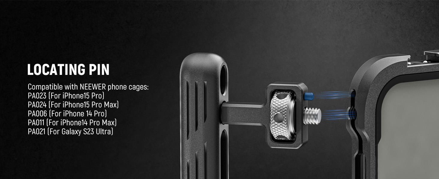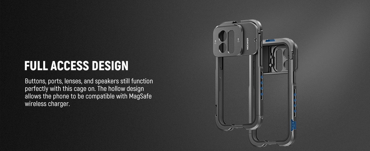 Compatible with iPhone 15 Pro Max - Only compatible with iPhone 15 Pro Max, this CNC machined aluminum alloy phone cage features dual side handles for stable handheld video shooting and a soft rubber cushion for reliable protection where you go. The hollow back is compatible with MagSafe wireless charger MagSafe battery pack and NEEWER PA010 Magnetic Phone Holder