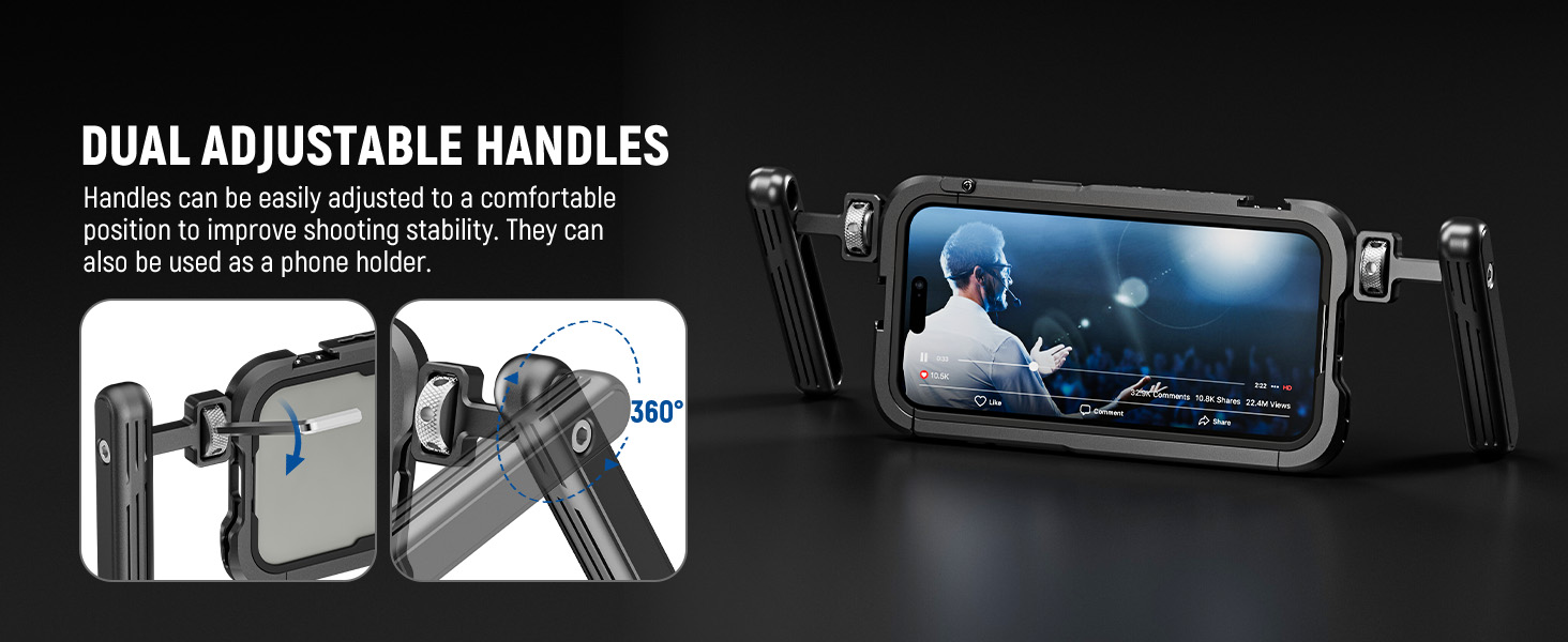 360° Rotatable Dual Side Handles- Two side handles can attach to the cage horizontally or vertically using 1/4" screws and rotate 360° via the built in damping, ideal for both handheld shooting and desktop phone stand shooting. For wireless capturing, please separately purchase our PA005E Bluetooth Side Handle. Note: After attaching the handle, use the hex key to secure the hand knob and prevent noise from loosening; Damping is not adjustable via the side screw.